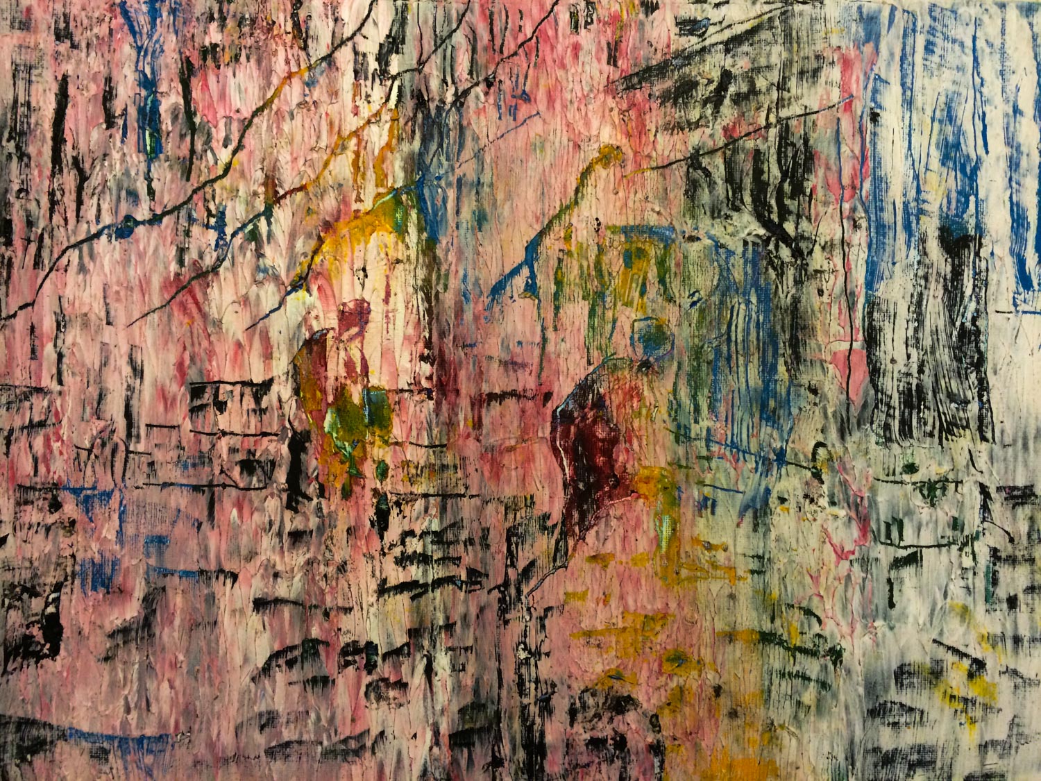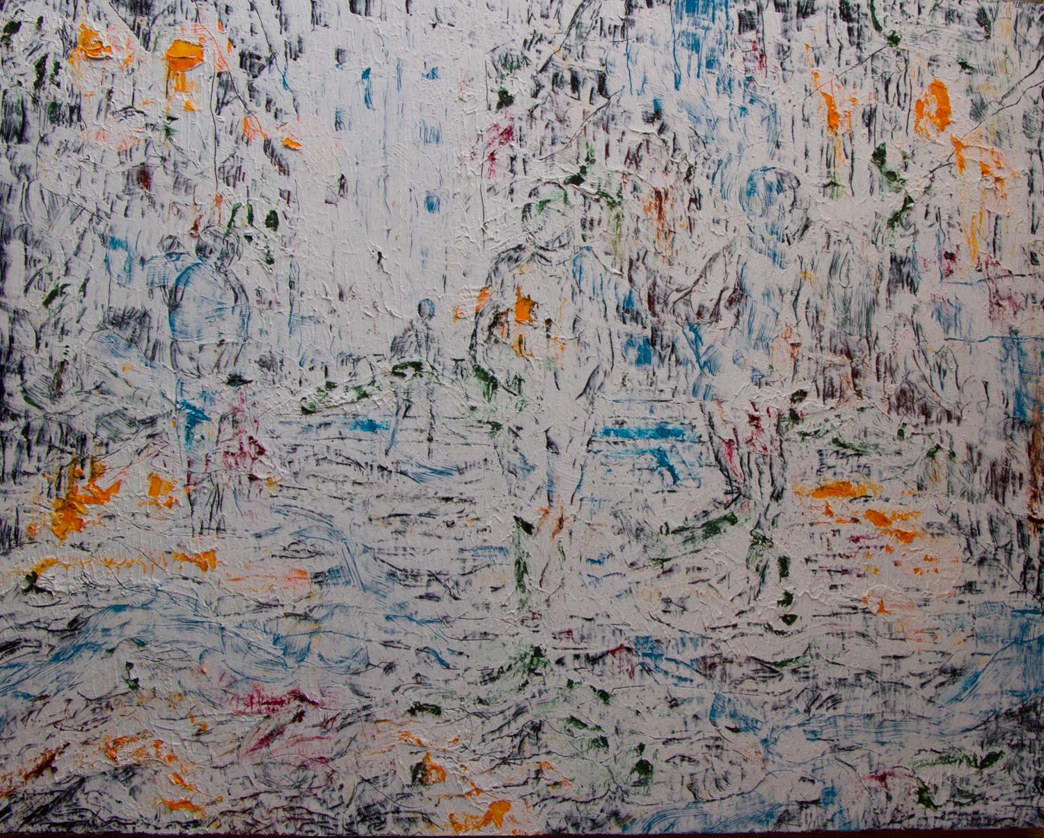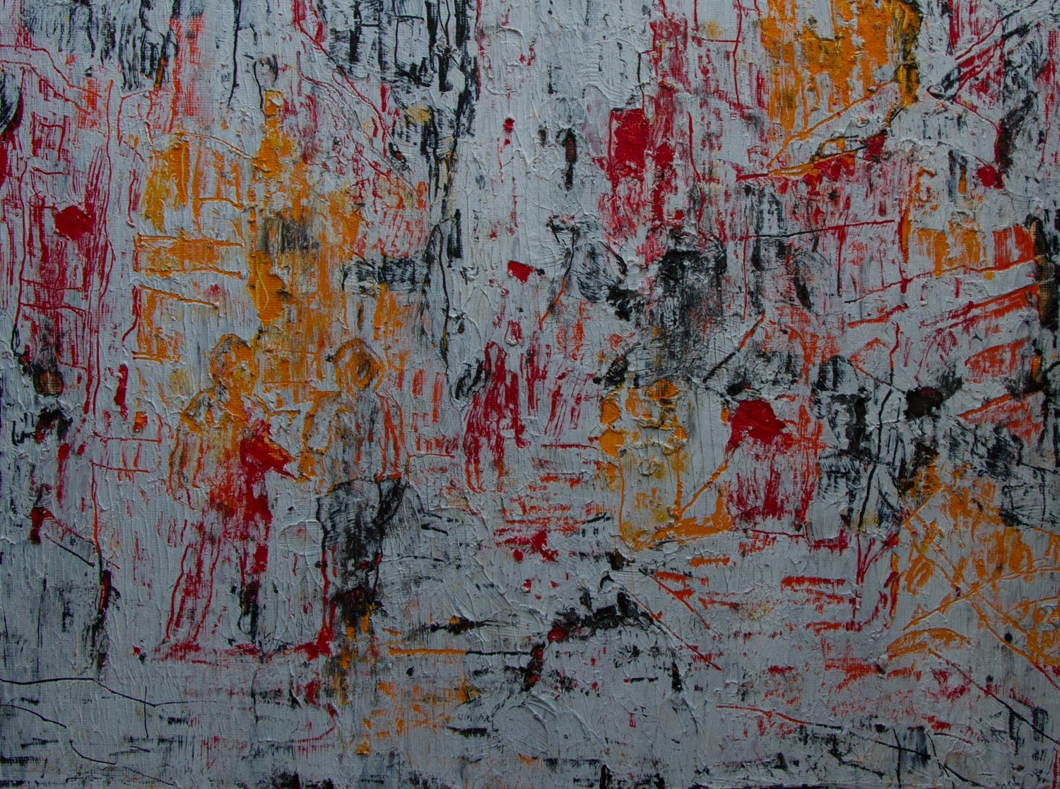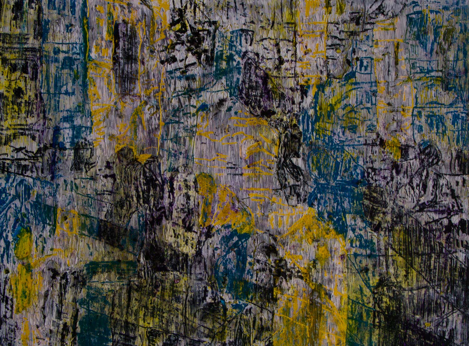 Figures in Destruction is a series of paintings that I am working on that show figures going on with life after a devastating event such as an earthquake or an act of war. We all have to keep going. I use a layering of oil colors and wax and then carve and scrape back into to it to reveal figures which I then accent and detail further by going back in and carving and adding paint as needed. I usually have a composition in mind when I begin these paintings although there are always surprises.